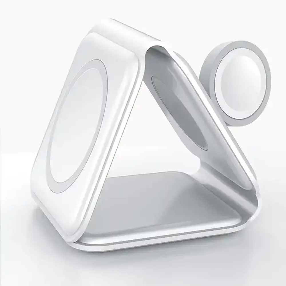 Kvalitní výkonná bezdrátová skládací 3 in 1 s podporou Apple MagSafe, iWatch, AirPods, ale i většiny telefonů, či příslušenství jiných značek podporujících bezdrátové QI nabíjení. Unikátní skládací řešení Vám umožňuje zvolit variantu použítí pouze jako podložku pro jedno zařízení, nebo stojánek případně nabíječku rozložit a nabíjet až tři zařízení. Nabíječku lze opět jednoduše složit do malé kompaktní podoby a v případě potřeby vložit do kapsy a jednoduše vzít kamkoli budete potřebovat.