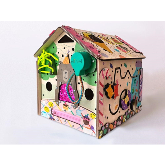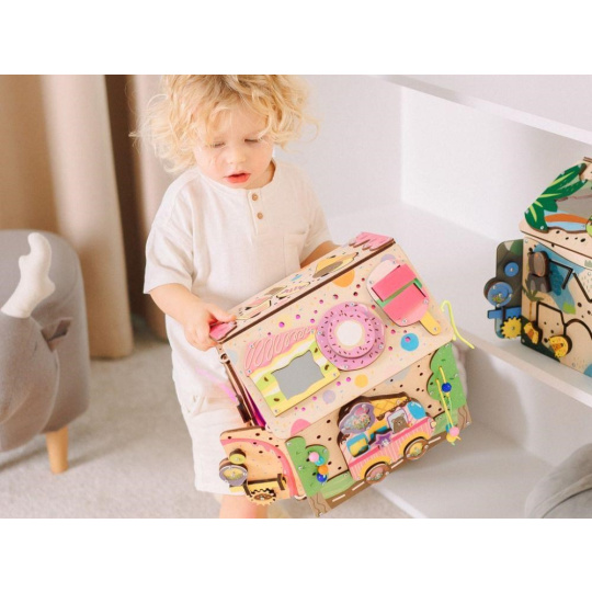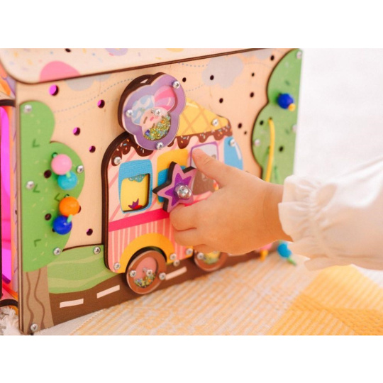 Originální svítící domeček activity board zavede děti do fantastického světa sladkostí. Se zmrzlinářským autem, s mlsným medvídkem a se spoustou montessori a hracích prvků se děti vydají za sladkým dobrodružstvím, při kterém se skvěle zabaví a zdokonalí své dovednosti. Každá strana activity boardu je originální a nabízí nespočet možností ke hře. Acitivity board domeček Cukrovinky je navíc svítící, po zapnutí světla se uvnitř domečku rozsvítí růžové světlo..