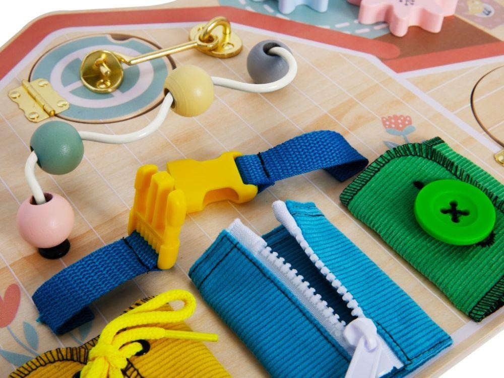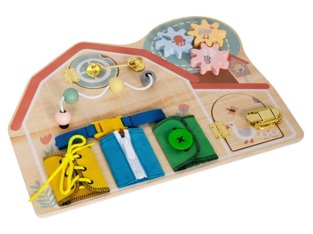 Activity board v podobě farmy zavede holčičky i chlapce na venkov, kde si pohrají s hracími prvky a osvojí si pár praktických dovedností. Activity board s ozubenými koly, korálkovým bludištěm, dvířky a okýnkem, různými zámky a různými způsoby zapínání vede děti k samostatnosti ve hře, v poznávání a učení se, v oblékání..
