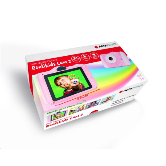 Realikids Cam 2 je ideální digitální fotoaparát pro děti. Jeho CMOS snímač umožňuje pořizovat nádherné fotografie a videa v HD. Má 3,5" LCD displej, na kterém si můžete prohlédnout vaše fotografie. Má také port pro micro SD karty až do 32 GB (není součástí dodávky). Jeho zábavný a ergonomický design zaručuje dokonalé uchopení a potěší každého malého fotografa.