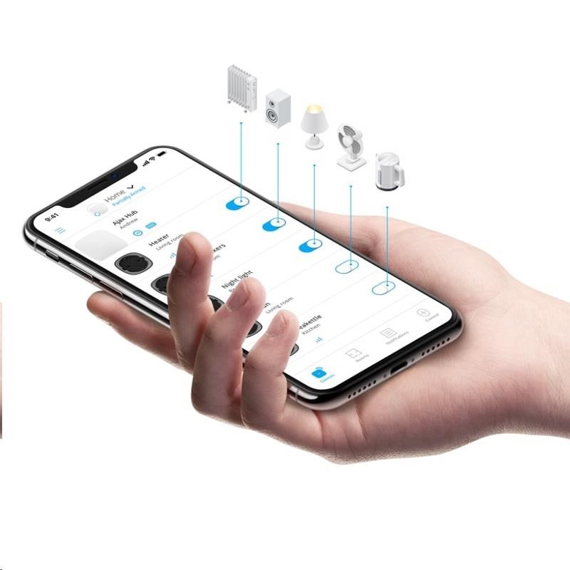 Ajax Socket umožňuje prostřednictvím chytré mobilní aplikace snadno ovládat připojené elektrické spotřebiče. Díky barevnému LED indikátoru zatížení a analytickým funkcím je možné měřit spotřebu elektrické energie.