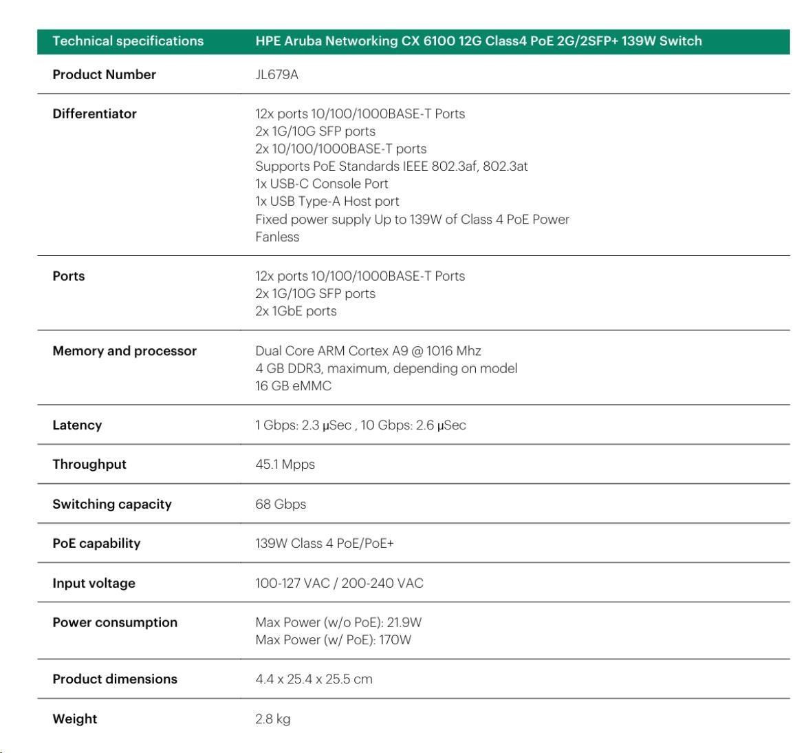 | Power supplies | Fixed power supply (165W) Up to 139W of Class 4 PoE Power |