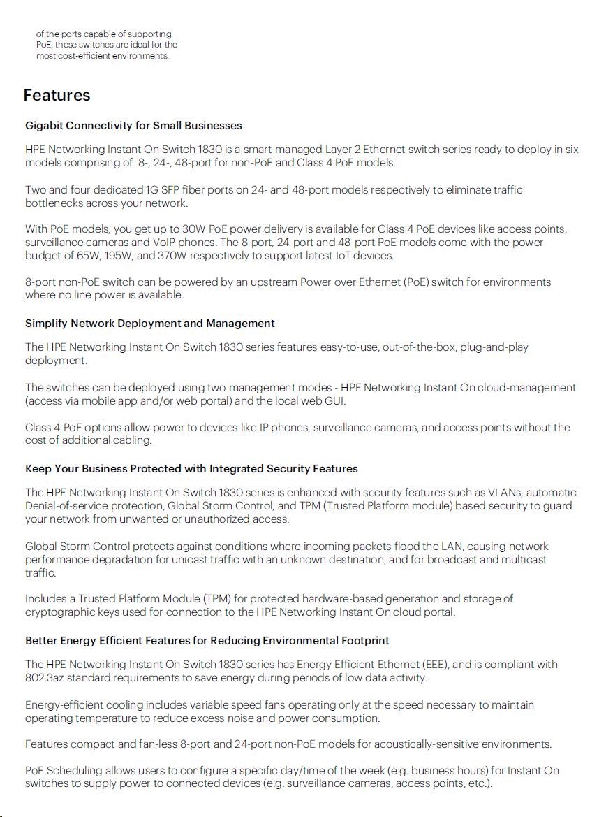 Aruba Instant On 1830 8G Switch (JL810A) | Aruba Instant On 1830 8G 4p Class4 PoE 65W Switch (JL811A) | Aruba Instant On 1830 24G 2SFP Switch (JL812A) | Aruba Instant On 1830 24G 12p Class4 PoE 2SFP 195W Switch (JL813A) | Aruba Instant On 1830 48G 4SFP Switch (JL814A) | Aruba Instant On 1830 48G 24p Class4 PoE 4SFP 370W Switch (JL815A) | ||||