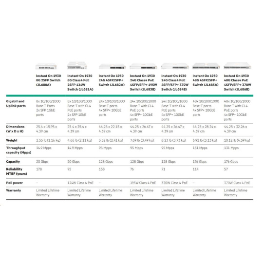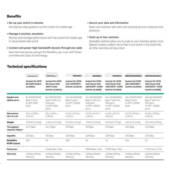The Aruba Instant On 1930 switches features advanced, smart-managed, fixed- configuration Gigabit switches designed for small businesses that are easy-to-deploy and affordable. They're made to handle today's bandwidth-heavy applications like voice and video conferencing, enabling consistent connectivity to enhance performance.