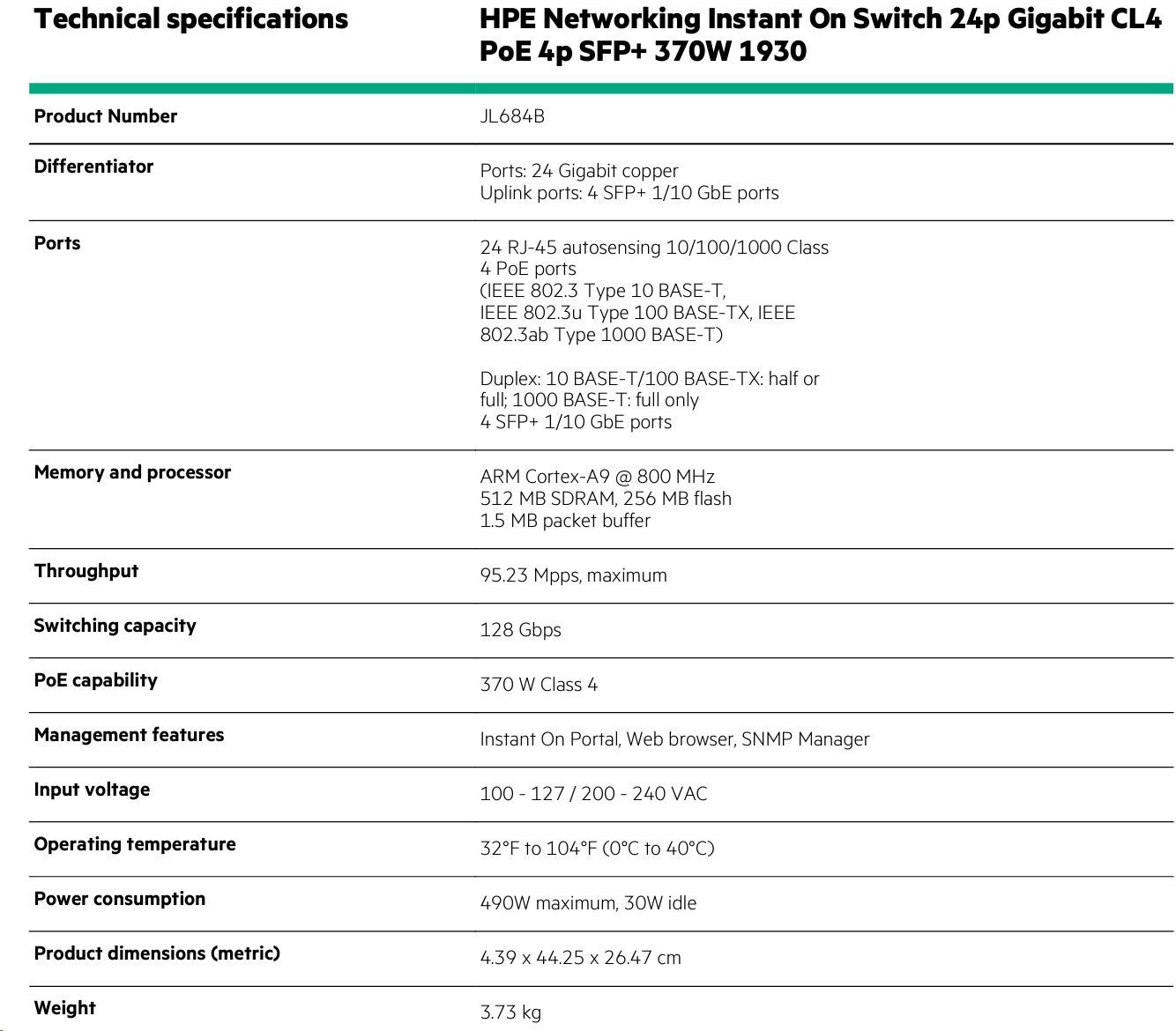 | PoE power | 370 W Class 4 PoE | |