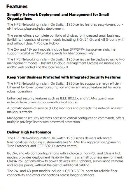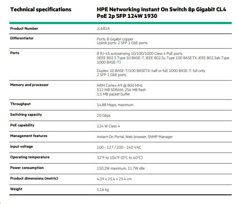 HPE Networking Instant On Switch 8p Gigabit CL4 PoE 2p SFP 124W 1930 (JL681A)