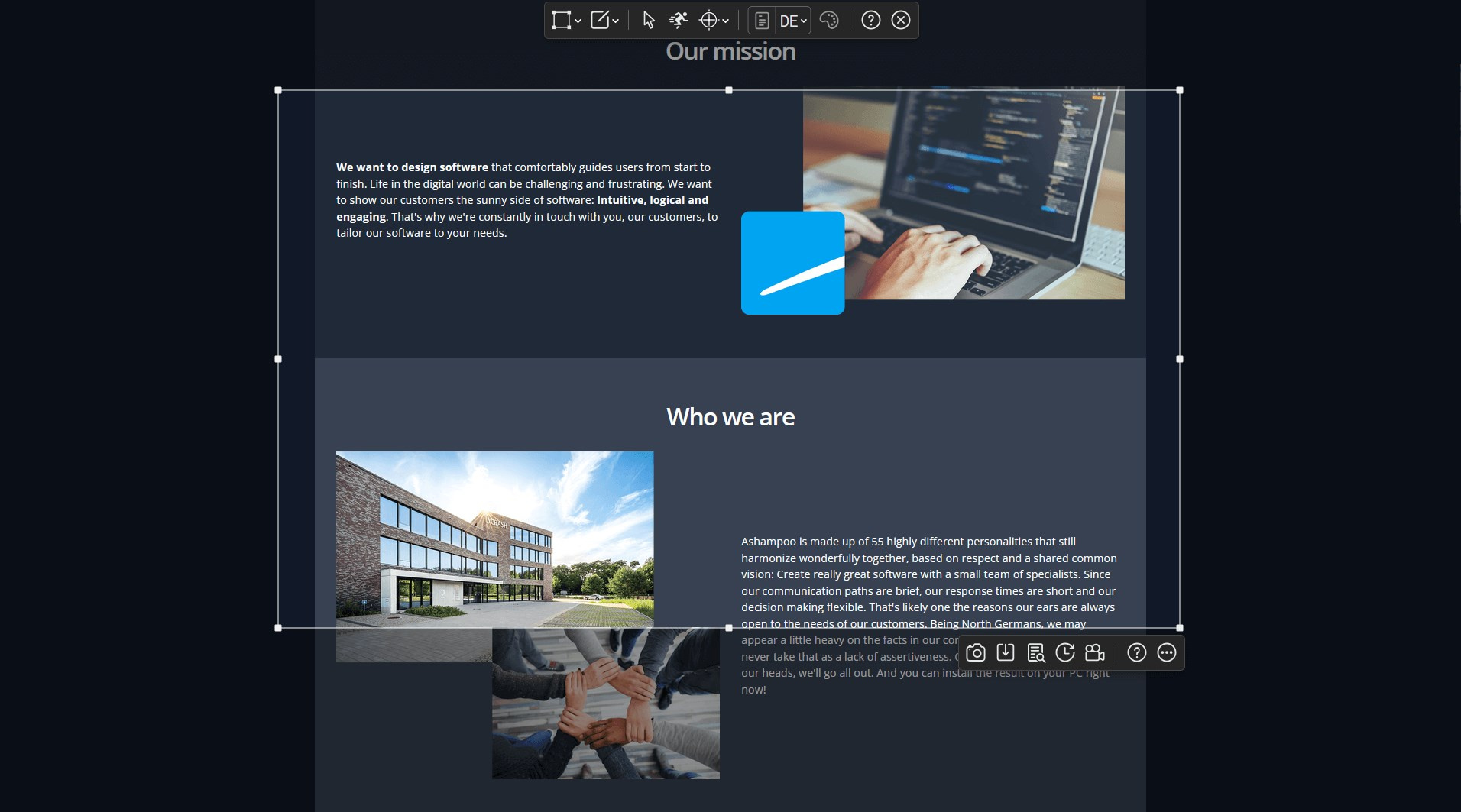 Jakmile je aplikace Snap aktivní, automaticky detekuje prvky pod ukazatelem myši (okna prohlížeče, nabídky programů, obrázky atd.) a nabízí okamžité snímání jedním kliknutím s přesností na pixely. Ale tím to nekončí: Snap dokáže zachytit i vlastní obdélníkové nebo volné oblasti a dokonce podporuje i rolovací obsah! Program samozřejmě podporuje všechny možné druhy sdílení, včetně e-mailu a Ashampoo Web!