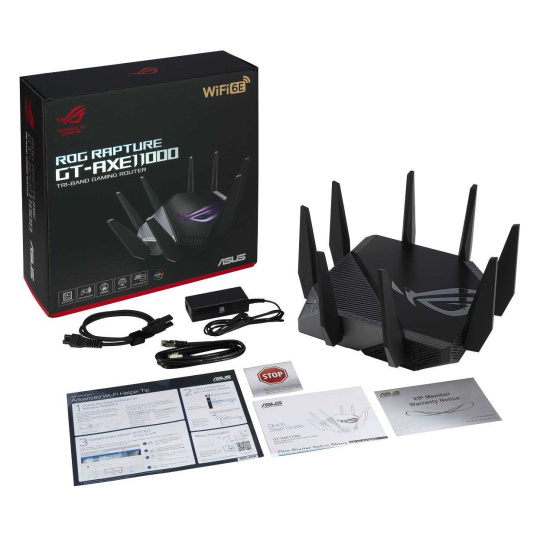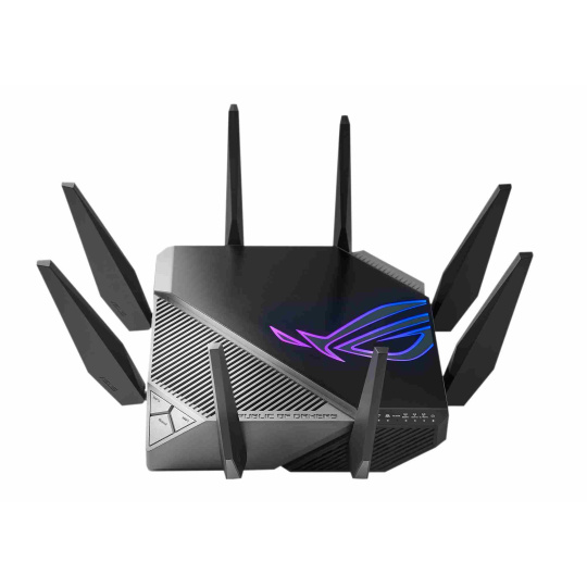 ROG Rapture GT-AXE11000 Třípásmový herní router GT-AXE11000 WiFi 6E (802.11ax), nové pásmo 6 GHz, 2.5G WAN/LAN port, kompatibilní s PS5, agregace WAN, VPN Fusion, tříúrovňová herní akcelerace, zabezpečení sítě zdarma a podpora AiMesh Standard WiFi nové generace – první třípásmový WiFi 6E router na světě zvyšuje rychlost až 11 000 Mb/s. Nové pásmo 6 GHz – Širší kanály a vyšší kapacita přinášejí vyšší výkon, nižší latenci a menší rušení. 2.5G WAN/LAN Port – Veškerý síťový provoz procházející přes 2.5G port má nejvyšší prioritu a 2.5G port tak dokáže plně využít potenciál WiFi 6. Výkon díky dokonalé technice – Čtyřjádrový procesor, pokročilý chladicí systém a optimalizovaný design antény přinášejí výpočetní schopnosti na zcela nové úrovni. Tříúrovňová herní akcelerace – Zrychlete přenos herních dat na každé zastávce, od vašeho zařízení až po herní server. RJ45 for Gigabits BaseT for WAN x 1, RJ45 for Gigabits BaseT for LAN x 4, RJ45 for 2.5G BaseT for WAN/LAN x 1 ROG Rapture Wifi 6 802.11ax Tri-band Gigabit Gaming Router Wifi 6 802.11ax 1148Mbps (2.4G) Wifi 6 802.11ax 4804Mbps (5GHz) Wifi 6E 802.11ax 4804Mbps (6GHz) OFDMA + MU-MIMO tech, 1024 QAM, Triple level Game Acceleration, Aura RGB lighting, ROG Boost Key, 2.5G Multi-Gigabit Gaming Port, WiFI Radar and Zero Wait DFS, AiProtection Pro, VPN Fusion Adaptive QoS, Bandwidth control, AiMesh, ASUS Roter APP (ROG theme).