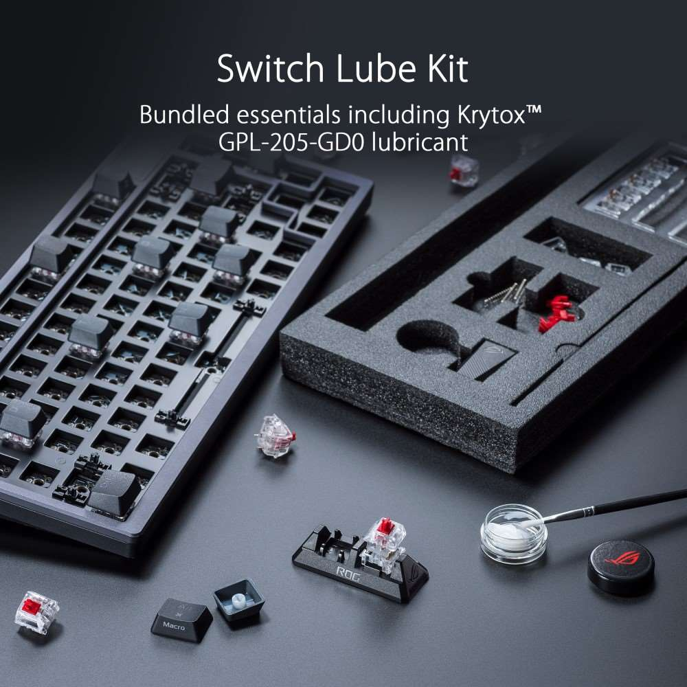 Zakázková herní klávesnice ROG Azoth s tvarovým faktorem klávesnice 75, těsněním, třívrstvou tlumicí pěnou a kovovým horním krytem, vysoce přizpůsobitelná s předem namazanými mechanickými spínači ROG NX vyměnitelnými za provozu, stabilizátory klávesnice ROG, kryty kláves PBT doubleshot a mazací sadou, tri - připojení režimu s 2,4 GHz technologií SpeedNova, OLED displejem, třícestným ovládacím knoflíkem, třemi úhly náklonu a podporou Mac