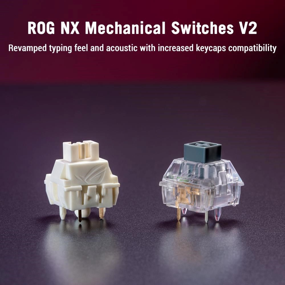 - Mechanické spínače ROG NX V2 s možností výměny za provozu: Podporují více profilů kláves a poskytují měkčí akustiku a vytříbenější pocit při psaní