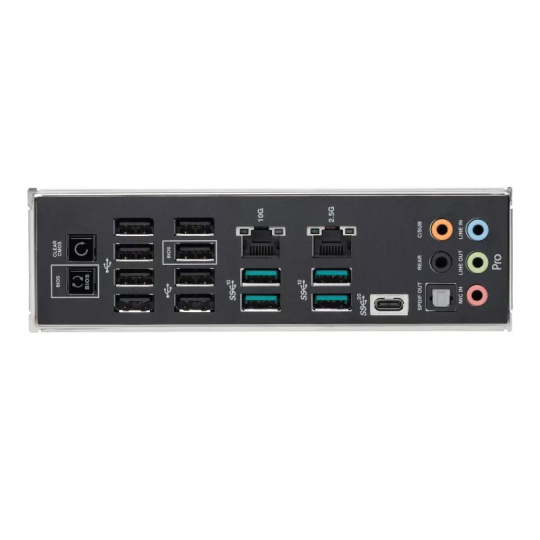 1 x USB 3.2 Gen 2x2 port(s) (1 x USB Type-C®) 4 x USB 3.2 Gen 2 port(s) (4 x Type-A) 8 x USB 2.0 port(s) (8 x Type-A) 1 x Marvell® AQtion 10Gb Ethernet port 1 x Intel® 2.5Gb Ethernet port 5 x Audio jacks 1 x Optical S/PDIF out port 1 x BIOS FlashBack™  button 1 x Clear CMOS button