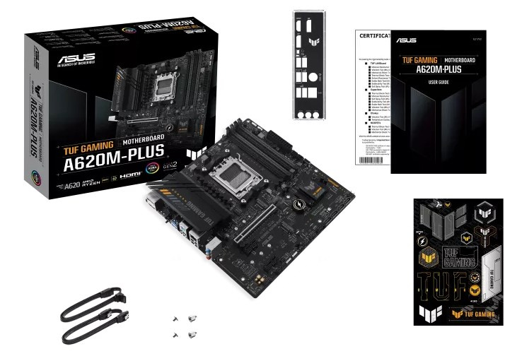 TUF GAMING A620M-PLUS is equipped with outstanding features, including 6-layer PCB design, DDR5 6400+(OC), Massive VRM Heatsink, PCIe 4.0 support, dual M.2 slots, Realtek 2.5Gb Ethernet, USB 3.2 Gen 1 ports, front USB 3.2 Gen 1 Type-C®, BIOS FlashBack™, 2 x DisplayPort, HDMI™, Addressable Gen 2 headers, Aura RGB header, Aura Sync, M.2 Q-Latch, Q-LED Core, ASUS OptiMem II, Fan Xpert 2+, Power Saving, Two-Way AI Noise Cancellation, Armoury Crate, ASUS TUF PROTECTION and SafeSlot Core+, which will bring users maximizing performance, stability and compatibility for the very best DIY PC experiences.