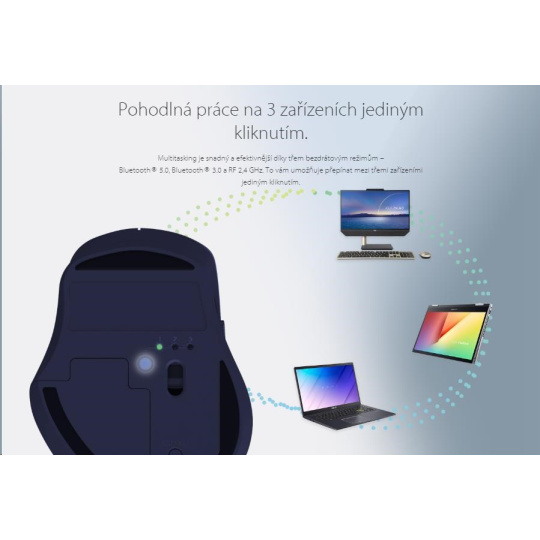 - Jedním kliknutím můžete pohodlně přepínat mezi třemi bezdrátovými zařízeními (Bluetooth® 5.0 / Bluetooth® 3.0 / RF 2,4 GHz).