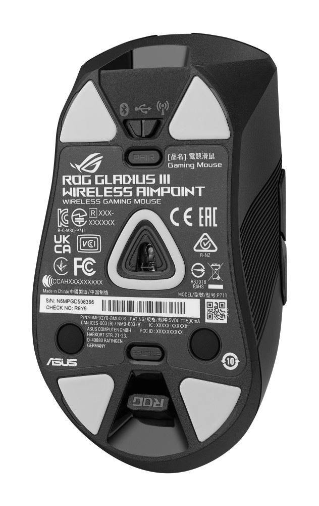 - Push-Fit Switch Socket II: Vyměnitelný design spínače pro snadné přizpůsobení; Gladius III Wireless AimPoint obsahuje mikrospínače ROG a je kompatibilní s dalšími 3pinovými mechanickými a 5pinovými optickými mikrospínači