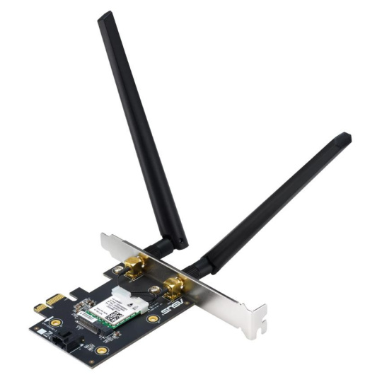WiFi 6E PCI-E Adapter with 2 external antennas. Supporting 6GHz band, 160MHz, Bluetooth 5.2, WPA3 network security, OFDMA and MU-MIMO ASUS WiFi 6E total solution - optimized capabilities and performance All-new 6 GHz band - Less congestion and interference for WiFi connections Latest Bluetooth® 5.2 - improved signal range, faster transmit speeds and less interference Ultrafast WiFi 6 & WiFi 6E – 4.6X faster speeds, improved connection efficiency and better network security Reduced dead zones with external antennas - Adjustable antennas allows easy positioning for the best reception. Wi-Fi 6E (802.11ax) AXE5400 Tri-Band PCIe Wi-Fi Adapter MU-MIMO 160Mhz-Gigabit WiFi (2402Mbps) Bluetooth 5.2 Tri Band 2.4G & 5G & 6G.