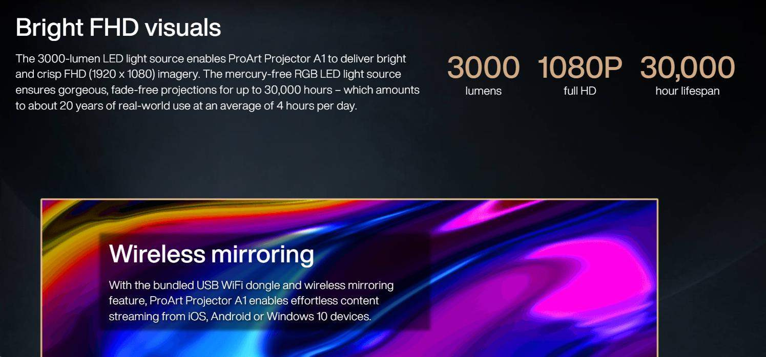 ASUS ProArt A1 LED professional projector- World’s first Calman Verified projector,? E < 2, 98% sRGB and Rec. 709, FHD (1920 x 1080), 3000 lumens, Four corner and 2D keystone correction, 1.2X zoom ratio, wireless mirroring