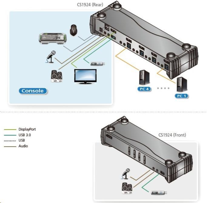 Přepínač má připojení pomocí DisplayPort kabelů, má integrovaný USB 3.0 2 portový HUB pro připojení dalších sdílených zařízení, podporu audia 2.1