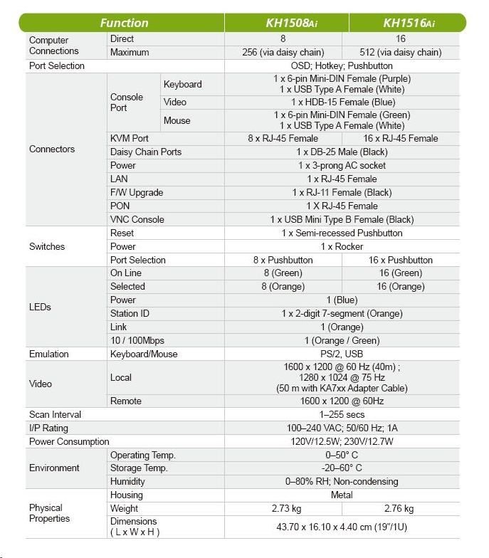 • vzdálenost mezi PC a KVM může být 40m pro 1600 x 1200 @ 60Hz