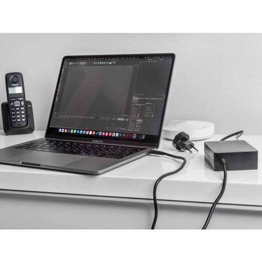 Součástí balení je 1,2m dlouhý síťový kabel a zástrčková vidlice - cestovní redukce pro zapojení nabíjecího adaptéru přímo do zásuvky.