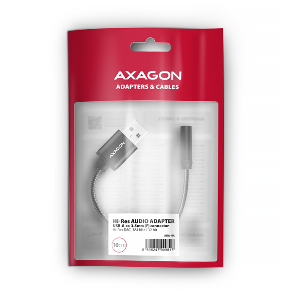 AXAGON ADA-HA Hi-Res DAC AUDIO ADAPTER je praktickým doplňkem pro notebook nebo stolní počítač s USB-A konektorem, který poskytne kvalitnější zvuk než vestavěný audio konektor. Adaptér funguje jako externí USB zvuková karta s DAC převodníkem podporujícím Hi-Res Audio se vzorkováním až 384 kHz / 32 bitů, což zajišťuje čistý a detailní zvuk.
