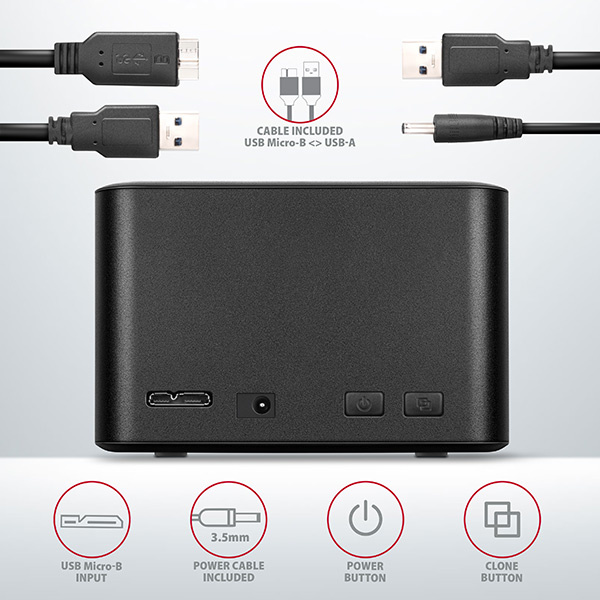 SuperSpeed USB 5 Gbps dokovací / klonovací stanice AXAGON ADSA-D25 CLONE MINI připojí k počítači snadno a rychle až dva 2.5" disky současně. Připojení k počítači umožňuje USB Micro-B konektor na doku spolu s dodávaným kabelem USB Micro-B <-> USB-A.