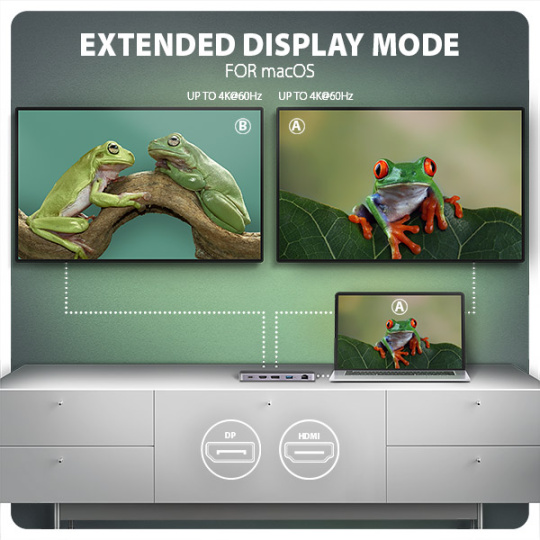 HDMI a DisplayPort výstupy poskytují kvalitní obraz. Ať při použití samostatně nebo současně, nabízí porty rozlišení až 4K/60Hz Ultra HD a podporují přenos vícekanálového zvuku. Podporovány jsou také vysoké frekvence v oblíbených hráčských rozlišeních 2K/144Hz nebo FullHD/240Hz. Díky podpoře HDR (vysoce dynamický rozsah) si můžete bez omezení vychutnat výrazně rozšířený rozsah barev a kontrastů. Pro správné fungování video výstupů je nutné, aby notebook měl USB-C port s podporou DisplayPort Alternate Mode (DP Alt Mode) nebo port Thunderbolt 3 a výše.