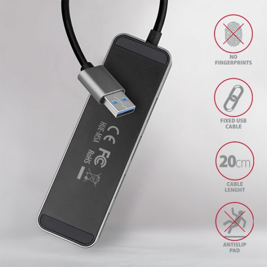 AXAGON HUE-MSA, 4x USB 3.2 Gen 1 SWITCH hub, kovový, micro USB nap. konektor, kabel USB-A 20cm