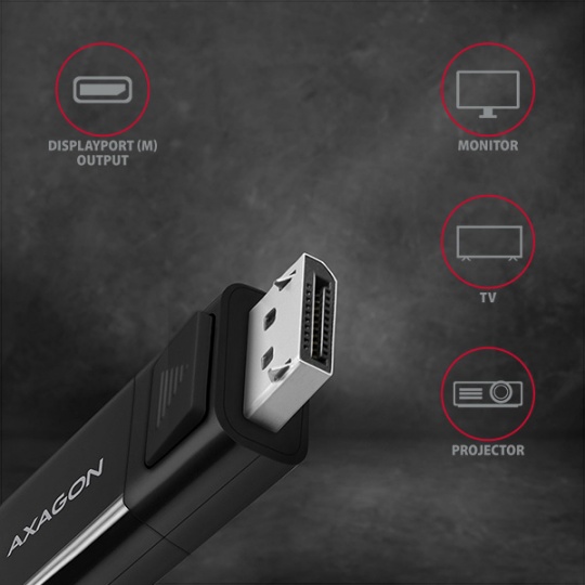 Aktivní USB-C -> DisplayPort kabel - redukce AXAGON RVC-DPC pro připojení DisplayPort monitoru/TV/projektoru k notebooku nebo telefonu pomocí USB-C konektoru.
