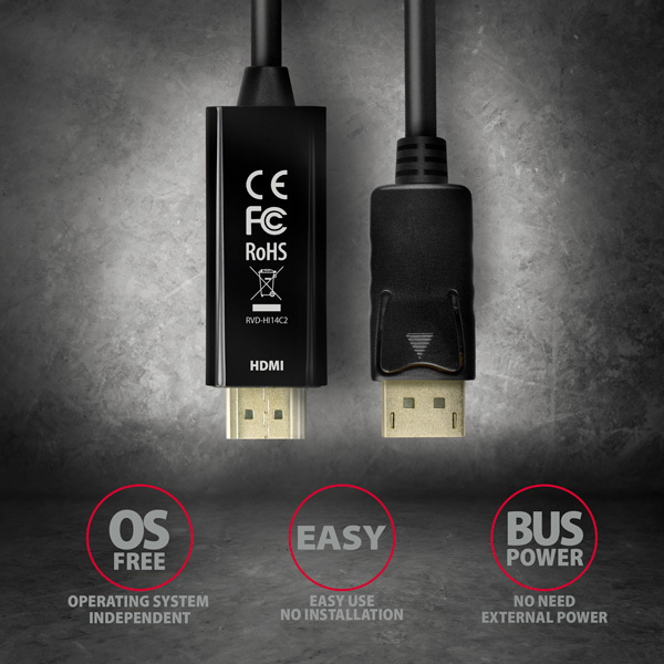 DisplayPort -> HDMI aktivní kabel - redukce AXAGON RVD-HI14C2 pro připojení HDMI monitoru/TV/projektoru k počítači s výstupem DisplayPort.