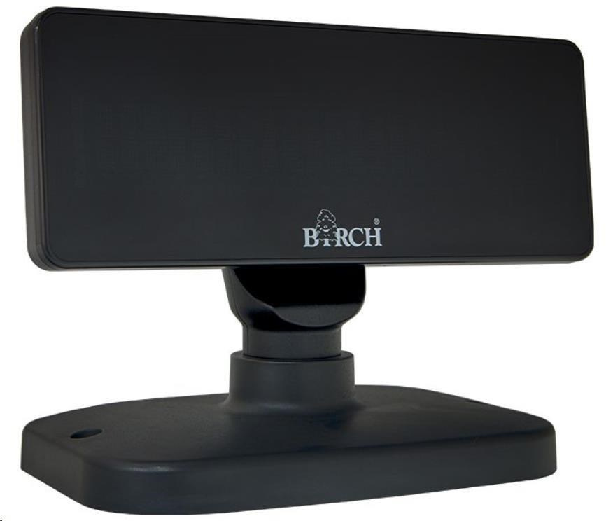 Birch DSP-V9 je zákaznický alfanumerický VFD displej k pokladním, poštovním a jiným přepážkám za bezkonkurenční cenu. Zobrazuje 40 znaků ve dvou řádcích velkým, vysoce svítivým písmem. Ovládání je prostřednictvím rozhraní USB nebo RS232 standardním příkazovým jazykem podle Vašeho výběru (LD220, DSP800, UTC/S, ESC/POS, AEDEX, CD5220 a další). Jeho hlavici lze horizontálně otočit až o 355°.