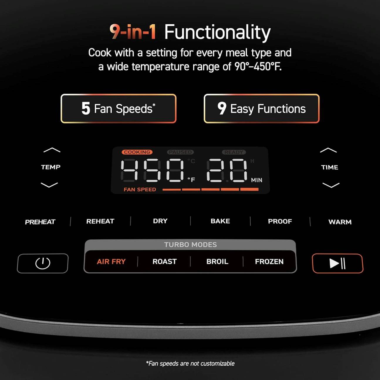 Ventilátor automaticky upravuje rychlost mezi 1 000 – 3 600 ot./min v závislosti na zvoleném režimu 1 až 5, což umožňuje rychlou a rovnoměrnou přípravu jídla. Při přípravě pokrmů ve fritéze Cosori Turbo Blaze díky tomu nemusíte jídlo přetřepávat nebo míchat jak u tradičních horkovzdušných fritéz.