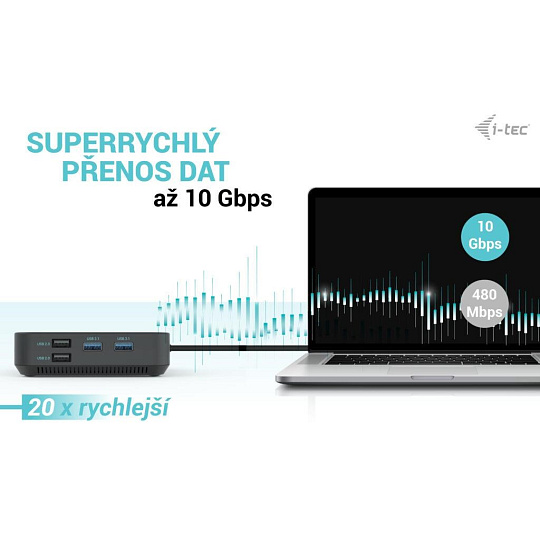 6x USB-port (5x USB-A, 1x USB-C) usnadňuje připojení více USB zařízení a periferií.