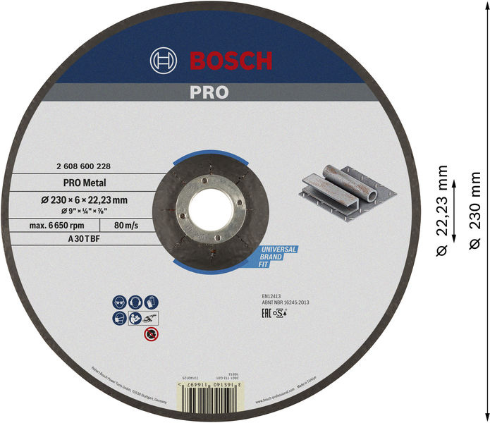 Navržený pro broušení kovu - Kotouč PRO Metal jsme vyrobili pro kovoobráběče, kteří potřebují spolehlivý hrubovací kotouč s dlouhou životností k broušení kovu. Odolný hrubovací kotouč PRO Metal využívá vysoce kvalitní korundová zrna k efektivnímu broušení kovu a oceli. Zrna zkombinovaná s funkčními plnivy a zalitá do matrice z fenolové pryskyřice zajišťují pevnost, odolnost vůči teplu a stabilní výkonnost. Přesně vyrobená síť ze skelných vláken vyztužuje kotouč pro větší bezpečnost. S otvorem 22,23 mm pro standardní úhlové brusky s pojistnou maticí.
