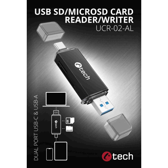 Univerzální kompaktní USB čtečka paměťových karet C-tech UCR-02-AL se díky dualnímu konektoru a široké podpoře podporovaných paměťových karet typu SD stané vítaným rozšířením vašeho počítače, notebooku či mobilního zařízení. Čtečka podporuje všechny současné verze SD a microSD karet včetně SDXC a microSDXC s kapacitou až 512GB. K zařízení ji snadno připojíte pomocí USB-A nebo USB-C konektoru a svému uživateli nabídne přenos dat rychlostí až 5Gbps. Kovové tělo čtečky nejen skvěle vypadá, ale zvyšuje také její odolnost. Oba konektory jsou při přenášení chráněny krytkami. Díky USB 3.0 rozhraní dosahuje čtečka výrazně vyšších přenosových rychlostí u karet oproti čtečkám s USB 2.0 rozhraním. Čtečka potěší možností současné práce s kartami v obou slotech a přímého kopírování mezi nimi. Nechybí široká podpora operačních systémů a podpora Plug and Play standartu díky kterému stačí pouze připojit k zařízení a počkat na automatickou instalaci ovladačů a následně začít čtečku plně využívat. Za pomocí funkce OTG ji snadno propojíte s vaším mobilním telefonem.