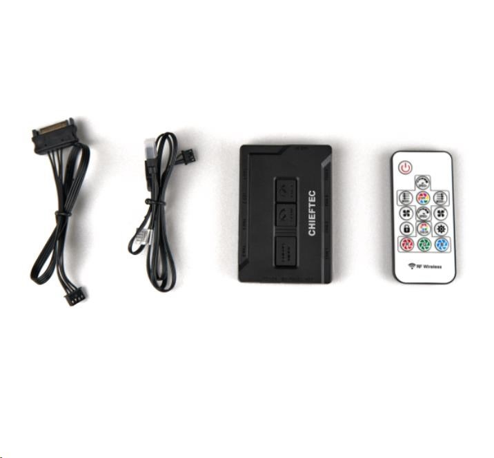 | Scope of delivery | Set of screws, instruction manual, thumb screws, remote control RGB control hub (DF-908) with 3PIN +5V M/B Sync and SATA power cable Front: 3x 120mm A-RGB rainbow fans pre-installed Rear: 1x 120mm A-RGB rainbow fan pre-installed |