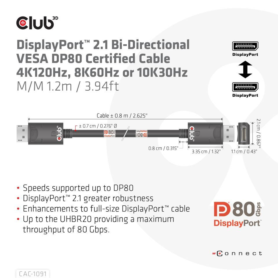 Kabel Club 3D CAC-1091 DisplayPort™ 2.1 umožňuje připojení vašeho (herního) PC nebo notebooku s podporou DisplayPort™ k (Ultra) monitoru s vysokým rozlišením nebo jinému zařízení s podporou DisplayPort™. DisplayPort™ 2.1 UHBR10/13.5/20 až 80 Gb/s, má také podporu pro Display Stream Compression 1.2 (DSC), Forward Error Correction a rozšiřuje maximální počet vložených audio kanálů na 32. Disponuje uzamykatelnými konektory DisplayPort™ zajišťujícími bezpečný , spolehlivé spojení, s NOVÝMI kontaktními prsty speciálně navrženými pro tyto vysoké rychlosti. Jednoduše stiskněte vestavěné jednodotykové tlačítko pro odemknutí konektoru. Měkký plášť UltraFlex chrání kabel před ohybem a poškozením deformací.