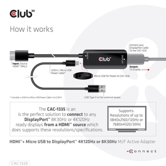 Club3D Adaptér HDMI + Micro USB na DisplayPort 4K120Hz/8K30Hz, Active Adapter M/F