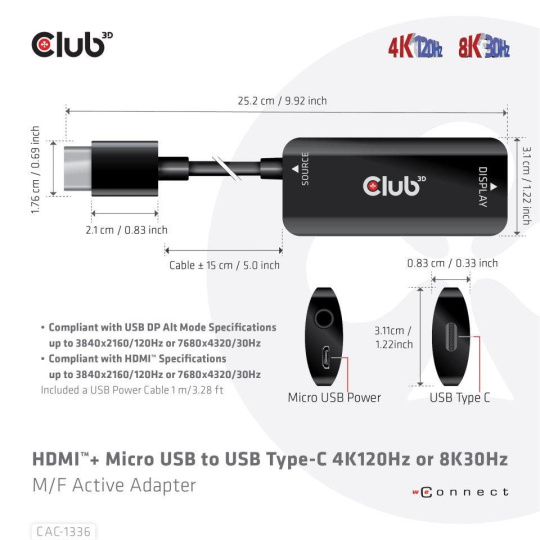 The Club 3D CAC-1336 is the perfect solution to connect to any USB Type-C 8K30Hz or 4K120Hz ready displays from a HDMI™ source which does supports these resolutions/specifications.