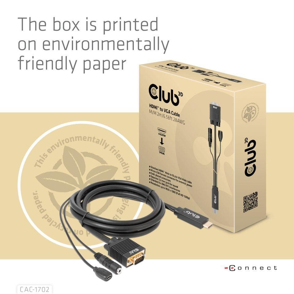The Club 3D CAC-1712 HDMI™ to VGA Cable M/M 2m/6.56ft 28AWG links any HDMI™-equipped desktop, laptop or adapter to a monitor, display, beamer or projector with a 15-pin VGA Female port. Ideal for at home or work, the cable creates a reliable connection for anything from gaming to video projection and supports up to Full HD 1080p(max. resolution of 1920 x 1080).