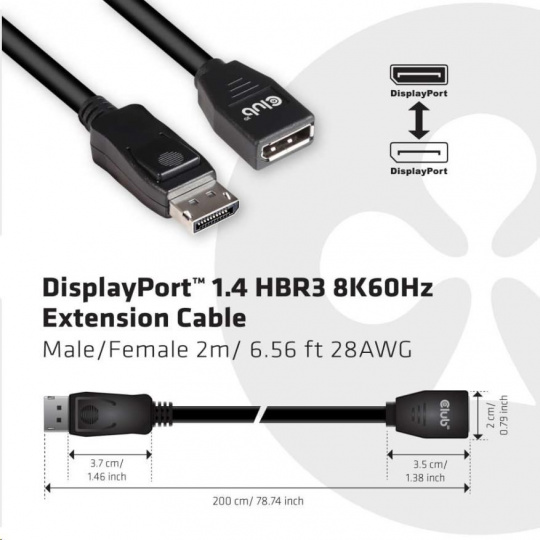 • Club 3D DisplayPort™ 1.4 HBR3 8K60Hz Extension Cable Male/Female 2m/ 6.56 ft 28AWG.