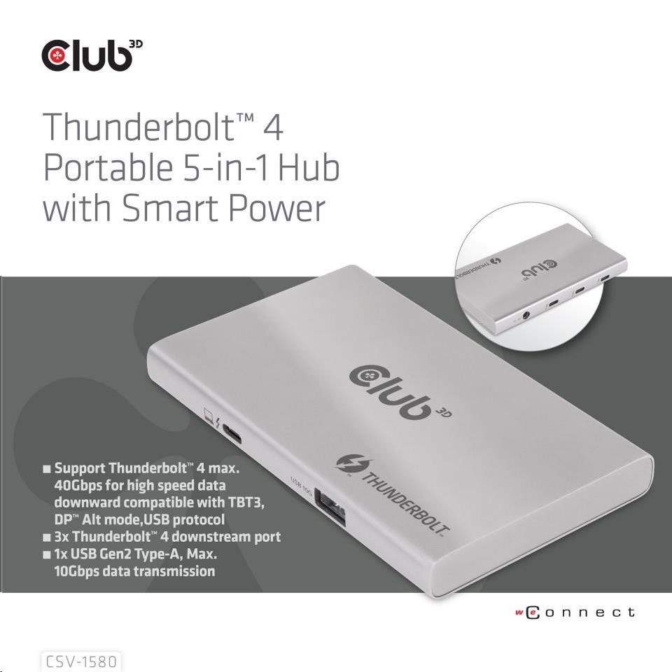 The Club 3D CSV-1580 is a Certified Thunderbolt™ 4 portable Hub which provides the most advanced, efficient, and versatile I/O solution available with up to 40Gb/s for data and video. For the first time this Thunderbolt™ 4 modern Hub has 3 Thunderbolt™ 4 downstream ports that allow you to cascade Thunderbolt™ 4 devices to one 8K30Hz or two 4K60Hz monitors, it can also easily connect to any USB Type-C device, all while simultaneously charging the PC. Besides, it supports Smart Power function which enables to distribute power according to the power consumption of the connected device, making full use of external power supply. It is designed for Thunderbolt™ 4 based PCs and Thunderbolt™ 3 based Macs™ utilizing MacOS™ 11 and later versions.