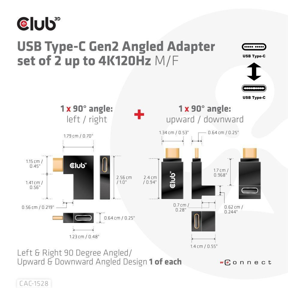 Club3D set adapterů USB-C Gen2 angled adapter set of 2, 4K120Hz, 240W, (M/F)