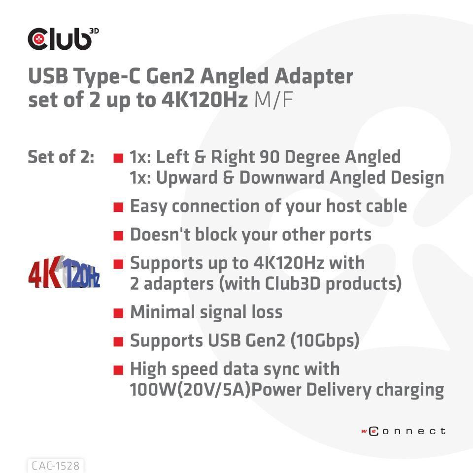 The Club 3D CAC-1528 USB Type-C Gen2 Angled Adapter set of 2 up to 4K120Hz M/F is a versatile set of angled connector adapters providing cable management solutions. With either- or both- conector adapters you can avoid blocking other ports on your host device. Also for displays with a USB Type-C input this can be an easy fix for not blocking other ports and/or bending cables. This set contains 1 of each adapters and are universal in their usage, Data, Video and Power Delivery up to 100W(20V/5A). The adapters are verified with Club 3D products to support up to 4K120Hz. Supports USB Gen2 up to 10Gbps of data speed.