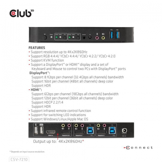 The CSV-7210 is a high performance DisplayPort™ KVM (Keyboard Video and Mouse) switcher. It routes high definition videos up to 4096x2160 at 60Hz resolution and audio from any DisplayPort™ source to any HDMI™ or DisplayPort™ supported display. This DisplayPort™ KVM switcher not only has the key press switching function, but also has an intelligent function as well as hot pluggable function.