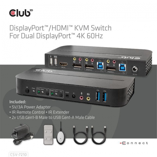 Club3D síťový přepínač - Switch, DP/HDMI KVM Switch - Dual DP 4K 60Hz