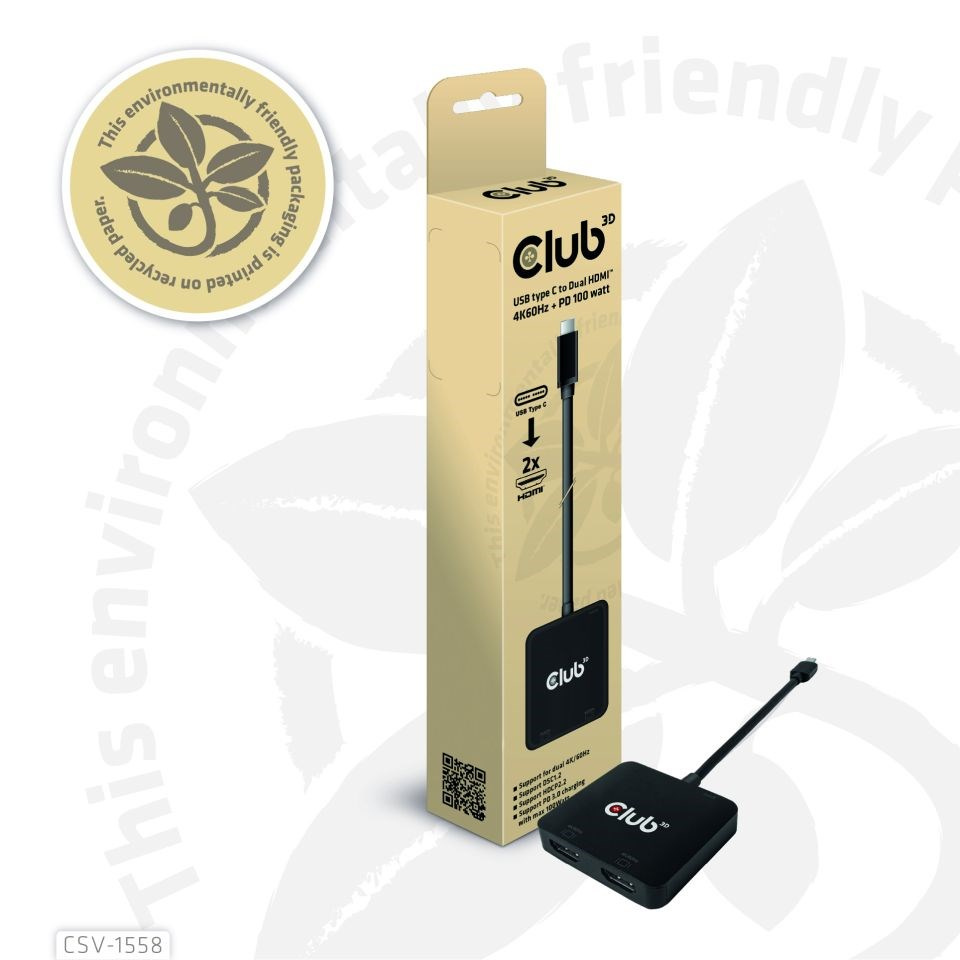 Club 3D CSV-1558 USB Type-C to Dual HDMI™ 4K60Hz + PD 100 watt Nabíjení v režimu DP1.4 Alt, umožňující rozšířit port USB Type-C hostitele na 2x HDMI™ displeje s ultra vysokým rozlišením max 4K60Hz pro každý displej současně. Díky podpoře funkce MST lze duální displeje zobrazovat současně s různým obsahem videa. Kromě toho podporuje nabíjení PD s maximálním výkonem 100 W. Může fungovat na všech zařízeních USB Type-C nebo Thunderbolt™ s podporou režimu DP™ Alt (včetně telefonů s připojením USB Type-C a podporou režimu DP™ Alt).