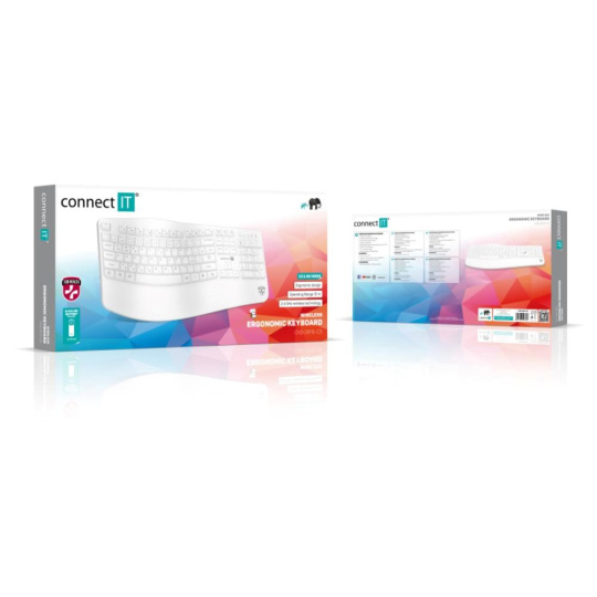 Klávesnice kromě klasických funkcí disponuje 12 multimediálními a funkčními klávesami, které se obzvláště hodí do kancelářského prostředí. Příjemný ergonomický náklon klávesnice pomáhá proti únavě zápěstí během dlouhých pracovních relacích. Samozřejmostí je jeden nano přijímač, který má dosah až 10 metrů. V balení je dodáváná originál CONNECT IT alkalická baterie (1x AA).