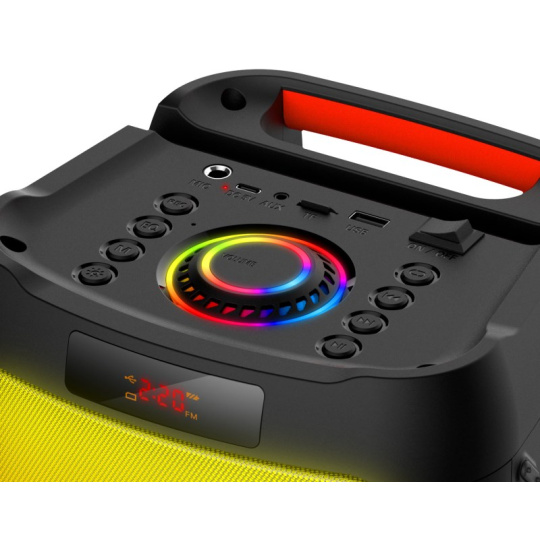 V horní části reproduktoru se nachází všechna potřebná ovládací tlačítka a nechybí ani vestavěný mikrofonu s funkcí hlasitého hands-free pro uskutečňování telefonních hovorů - stačí přijmout hovor a hlas volajícího slyšíte přímo v reproduktoru. Díky dodávánemu externím mikrofonu a KARAOKE funkcím na dálkovém ovládání si užijte spoustý zábavy s přáteli. Baterie s kapacitou 4500 mAh zabezpečí až 10 hodiny přehrávání a lze ji nabíjet pomocí dodávaného USB-C kabelu z jakékoliv USB nabíječky nebo power banky.
