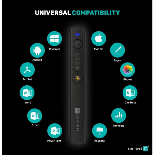 | Funkce prezentéru | - TAB/ENTER/ALT+TAB - PAGE UP/FULL SCREEN - PAGE DOWN/BLACK SCREEN - VOLUME UP/PLAY/PAUSE - VOLUME DOWN/NEXT/PREVIOUS |