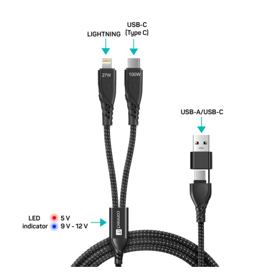 CONNECT IT Nabíjecí kabel Wirez 4v1, USB-C/USB, Lightning/USB-C, 1.25m, černá
